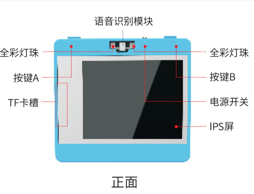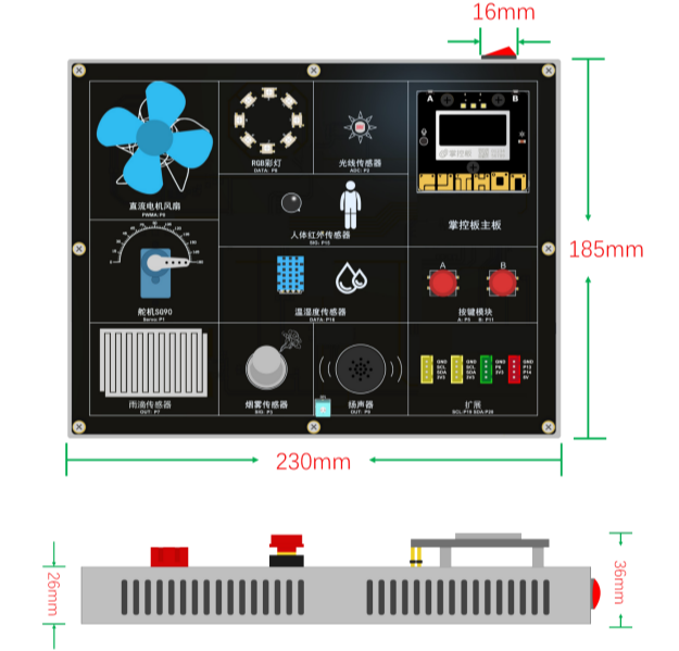 ★包含人體紅外傳感器、光線傳感器、溫濕度傳感器、RGB彩燈、直流電機風扇、舵機、雨滴傳感器、揚聲器、AI攝像頭、語音合成、以及按鍵、擴展等模塊;
